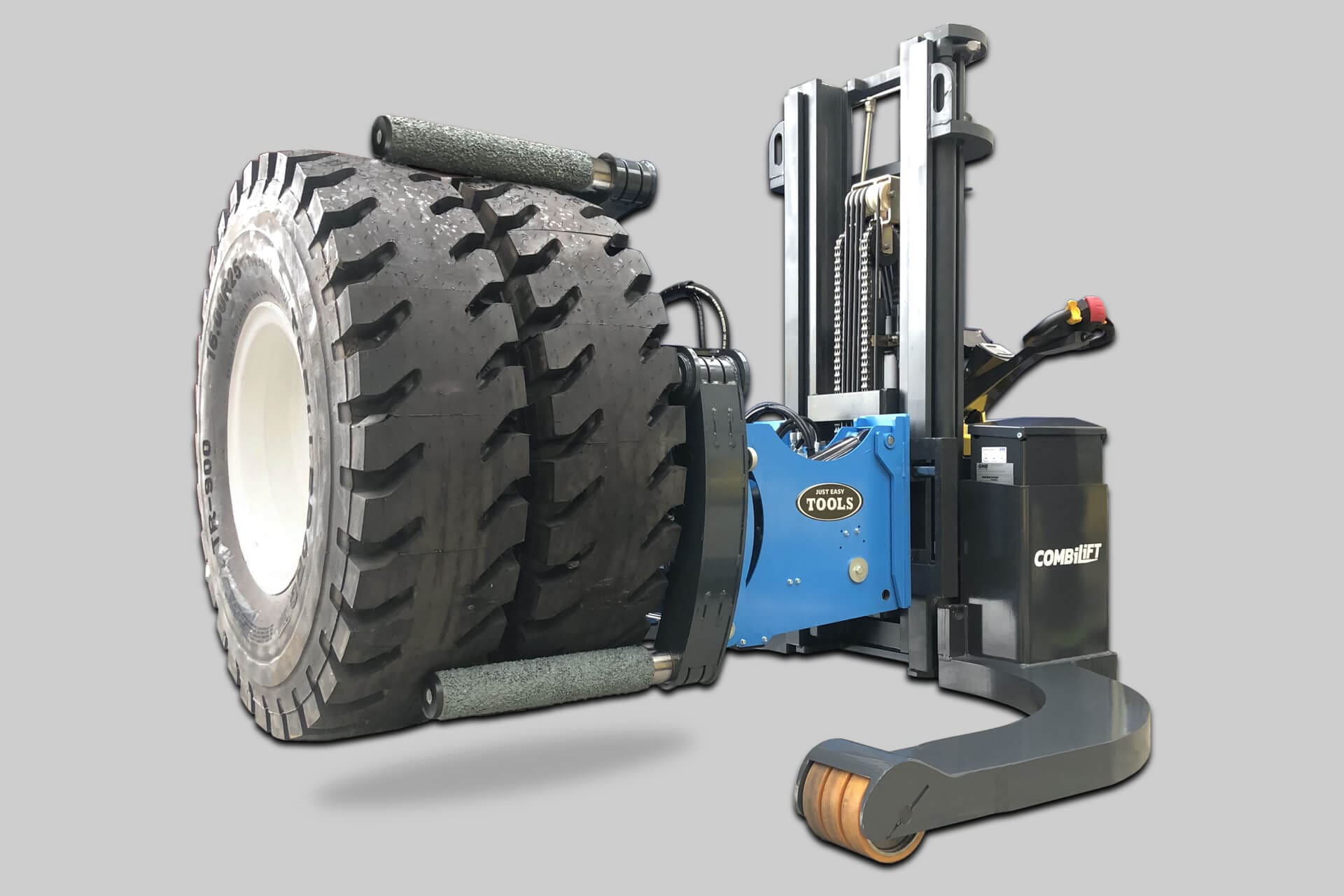 Grips, lifts, moves, tilts and rotates tyres from Ø850 – 2.400 mm (34 – 94”) and 2.000 kg (4.400 lbs) at a CoG of 550 mm (22”).