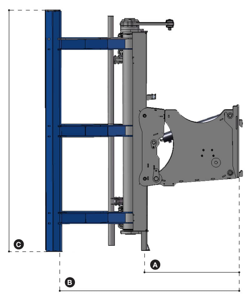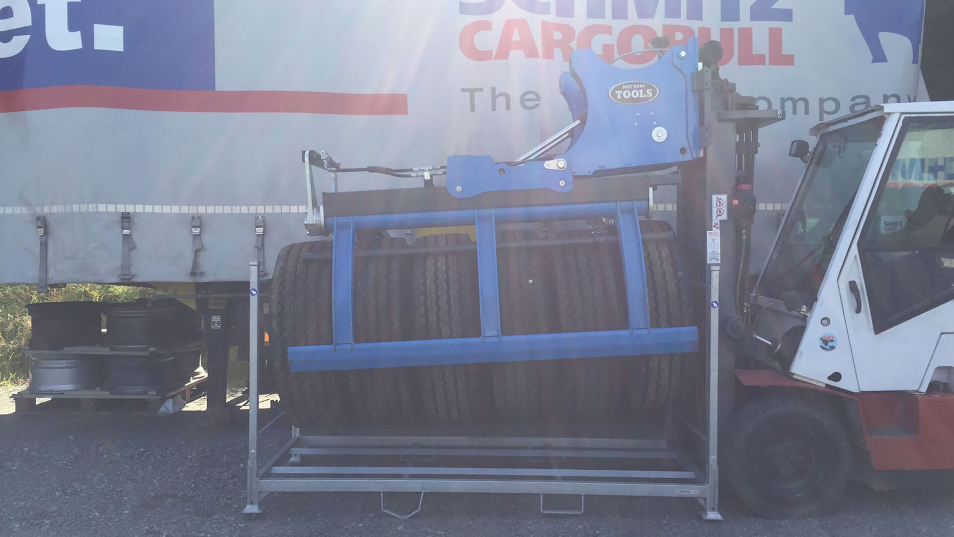 With a gripping range of Ø550-1.200 mm (22-47”), a grip length of 2.100 mm (82”) and a lifting capacity of 750 kg (1.650 lbs) the Easy Stacker 1200 can handle stacks of almost any truck tyre. With the 90° tilt module, rows of tyres can be stacked, and the design enables loading and unloading of containers and of trailers. Without any stressful and physical work.