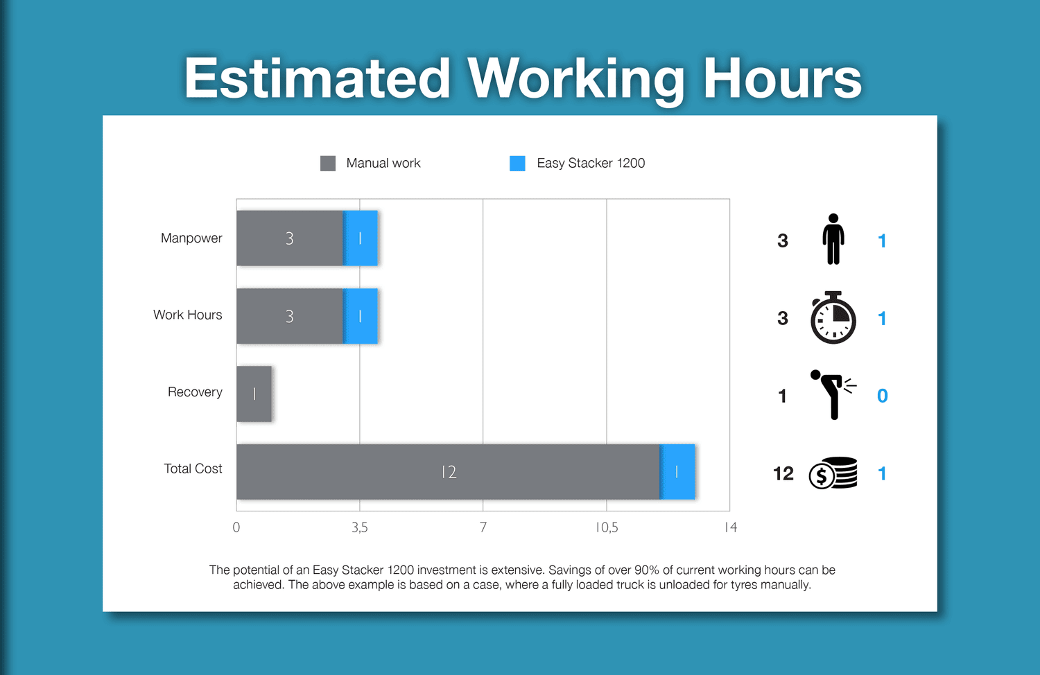 The Easy Stacker 1200 has a proven lifetime of more than 10 years. With an investment of only 10 euro per working day you get all the benefits of improved work safety, minimization of physical strain and increased productivity.